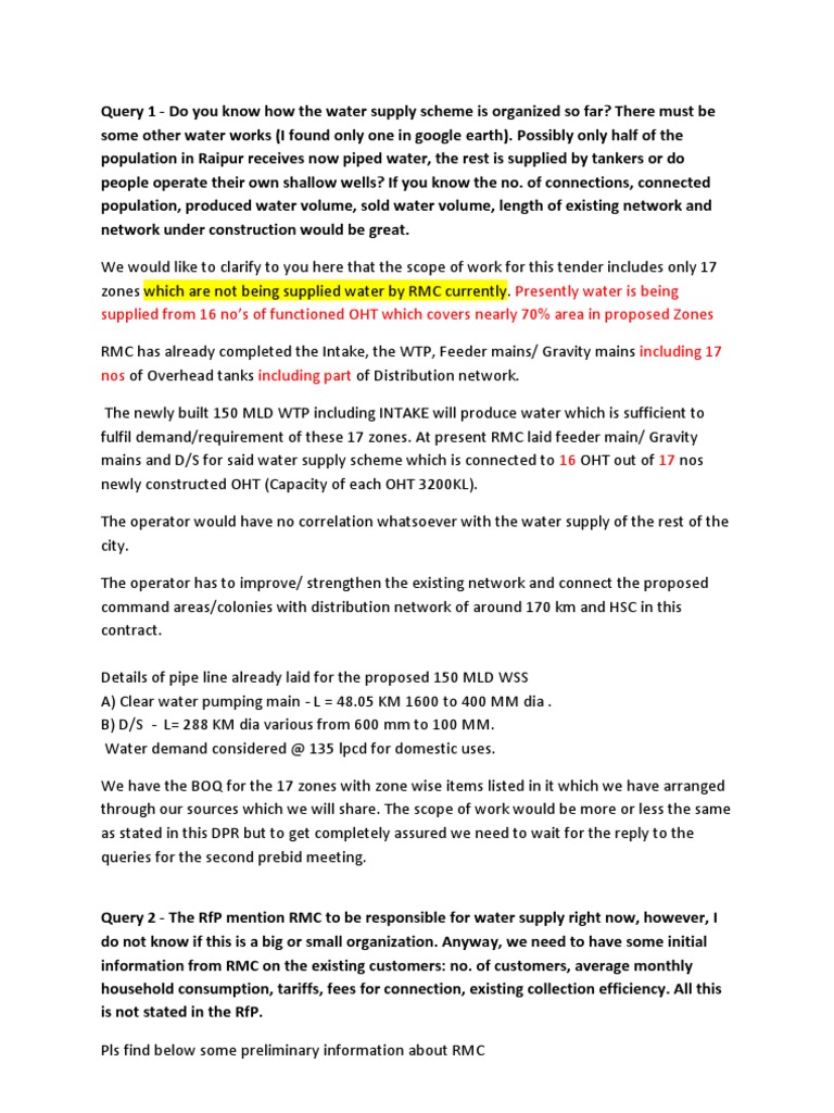 There must be some other water works (I found only one in google earth). Possibly only half of the population in Raipur receives now piped water, the rest is supplied by tankers or do people operate their own shallow wells? If you know the no. of connections, connected population, produced water volume, sold water volume, length of existing network and network under construction would be great. We would like to clarify to you here that the scope of work for this tender includes only 17 zones which are not being supplied water by RMC currently. Presently water is being supplied from 16 nos of functioned OHT which covers nearly 70% area in proposed Zones RMC has already completed the Intake, the WTP, Feeder mains/ Gravity mains including 17 nos of Overhead tanks including part of Distribution network. The newly built 150 MLD WTP including INTAKE will produce water which is sufficient to fulfil demand/requirement of these 17 zones. At present RMC laid feeder main/ Gravity mains and D/S for said water supply scheme which is connected to 16 OHT out of 17 nos newly constructed OHT (Capacity of each OHT 3200KL). The operator would have no correlation whatsoever with the water supply of the rest of the city. The operator has to improve/ strengthen the existing network and connect the proposed command areas/colonies with distribution network of around 170 km and HSC in this contract. Details of pipe line already laid for the proposed 150 MLD WSS A) Clear water pumping main - L = 48.05 KM 1600 to 400 MM dia . B) D/S - L= 288 KM dia various from 600 mm to 100 MM. Water demand considered @ 135 lpcd for domestic uses. We have the BOQ for the 17 zones with zone wise items listed in it which we have arranged through our sources which we will share. The scope of work would be more or less the same as stated in this DPR but to get completely assured we need to wait for the reply to the queries for the second prebid meeting.