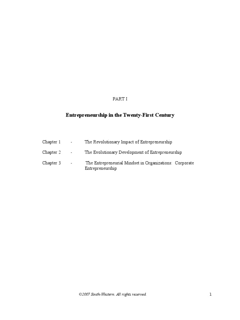 CHAPTER SUMMARY This opening chapter attempts to provide a broad perspective of the entrepreneurial revolution occurring throughout the U.S. and the World. Beginning with a discussion of entrepreneurs challenging the unknown like Olympic athletes, symphony conductors, or top gun pilots, the chapter presents the perspective of entrepreneurship as a force that has revolutionized business. The environment of entrepreneurship reflects a predominance of small firms and new ventures. Over the last few years, there has been a tremendous increase in new-venture activity. There are many statistics that illustrate this fact. For example, during the past ten years, new business incorporations averaged 600,000 per year. While many of these incorporations may have been sole proprietorships or partnerships previously, it still demonstrates venture activity, whether it was through start-ups, expansion, or development. More specifically, lets examine some of the latest tabulated numbers. Approximately one new firm with employees is established every year for every 300 adults in the United States. As the typical new firm has at least two owners-managers, one of every 150 adults participates in the founding a new firm each year. Substantially moreone in 12 are involved in trying to launch a new firm. The net result, then, is that the United States has a very robust level of firm creation. Among the 6 million establishments (single- and multi-site firms) with employees, approximately 600,000 to 800,000 are added each year. That translates into an annual birth rate of 14 to 16 per 100 existing establishments. More specifically, in the new millennium the number of businesses in the US has soared to over 25 million and is still growing at a rate of 2%. Collectively, US businesses posted over $20 trillion in annual revenues. Entrepreneurial firms are the essential mechanism by which millions enter the economic and social mainstream of American society. Small businesses enable millions of people including women, minorities, and immigrants, to access the American Dream. The greatest source of U.S. strength has always been the American Dream of economic growth, equal opportunity, and upward mobility. In this evolutionary process, entrepreneurship plays the crucial and indispensable role of providing the social glue that binds together both high-tech and Main Street activities. The US outranks the rest of the world in important entrepreneurial support such as entrepreneurship education training, financial support and favorable social norms. The entrepreneurial sector is poised to be an even more important factor in the USs future economic growth due to its adaptability to changing conditions and continued significant job creation. The chapter discusses ten specific developments that have occurred in the last few years. Many institutions have created programs for entrepreneurship research. The research focuses mainly on three areas: entrepreneurship education, outreach activities with entrepreneurs, and entrepreneurship research. The Internet is having tremendous impact on the global marketplace. The statistics appear to support this claim of profound change from the Internet explosion. U.S. businesses spent $85.7 billion on building up their Internet capabilities in 1999. For 2000, total spending will reach $120 billion. Smaller ventures use the Internet for a variety of operations, including customer-based identification, advertising, consumer sales, business-tobusiness transactions, e-mail, and private internal networks for employees. Seventy-eight percent