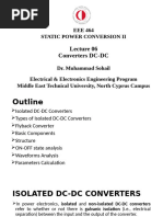 The Flyback converter is a DC to DC converter with a galvanic isolation between the input and the output(s). More precisely, the flyback converter is a buck-boost converter with the inductor split to form a transformer, so that the voltage ratios are multiplied with an additional advantage of isolation. When driving for example a plasma lamp or a voltage multiplier the rectifying diode of the Buck-Boost converter is left out and the device is called a flyback transformer. Due to intrinsic limitations, this converter is only used in low power applications (up to about 250 W).[citation needed]