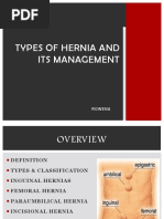 CONCLUSION A hernia is an abnormal protrusion of part of the intestines through a weak part of the abdomen, that is, part of the guts is poking through the abdominal wall. There are many type of hernia such as femoral hernia, umbilical hernia, incisional hernia, spigelian hernia, obturator hernia, epigastric hernia, inguinal hernia, and others. Ultimately, all hernias are caused by a combination of pressure and an opening or weakness of muscle or fascia: The pressure pushes an organ or tissue through the opening or weak spot. Sometimes the muscle weakness is present at birth; more often, it occurs later in life. Poor nutrition, smoking, and overexertion all can weaken muscles and make hernias more likely. Anything that causes an increase in pressure in the abdomen can then cause a hernia, including obesity, lifting heavy objects, diarrhea or constipation, or persistent coughing or sneezing. A hernia occurs when a small sac containing tissue protrudes through an opening in the muscles of the abdominal wall. The technical name for the operation that repairs a hernia is called a herniorrhaphy.