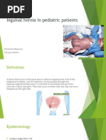 are femoral hernias. The incidence of inguinal hernias in children ranges up to 4.5%, while umbilical hernias occur in approximately 1 out of every 6 children. The incidence of incarcerated or strangulated hernias in pediatric patients is 1020%; 50% of these occur in infants younger than 6 months.12,21 2.3 TYPE Femoral hernia : The femoral canal is the path through which the femoral artery, vein, and nerve leave the abdominal cavity to enter the thigh. Although normally a tight space, sometimes it becomes large enough to allow abdominal contents (usually intestine) to protrude into the canal.
