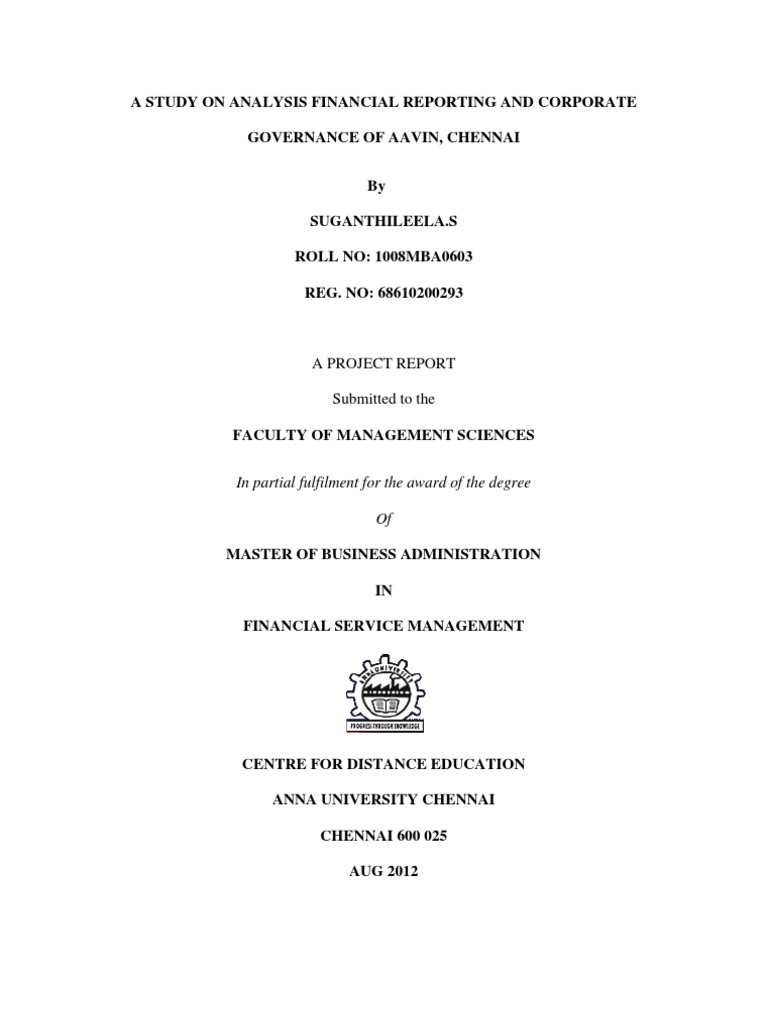 BONAFIDE CERTIFICATE Certified that the Project report titled A STUDY ON ANALYSIS FINANCIAL REPORTING AND CORPORATE GOVERNANCE OF AAVIN is the bonafide work of Miss.SUGANTHILEELA.S who carried out the work under my supervision. Certified further that to the best of my knowledge the work reported herein does not form part of any other project report or dissertation on the basis of which a degree or award was conferred on an earlier occasion on this or any other candidate.