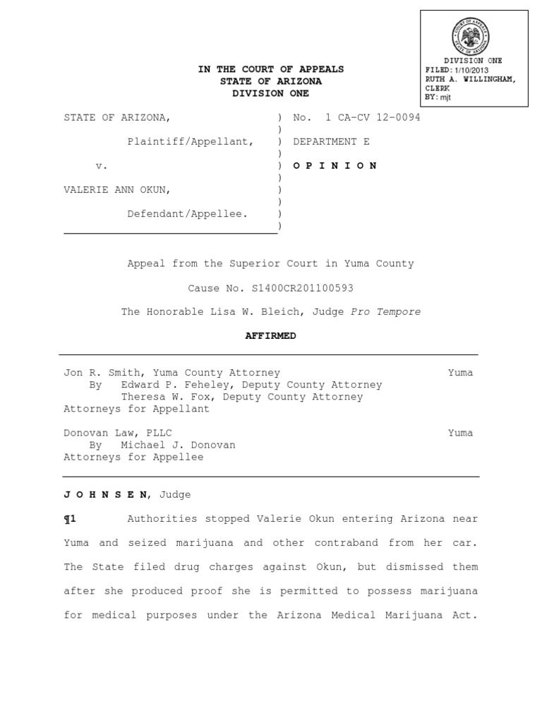 Valerie Okun marijuana ruling from Arizona appellate court.