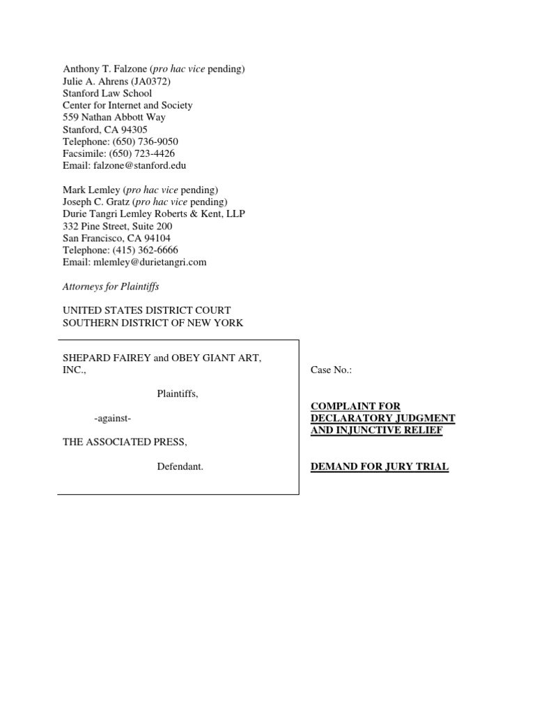1. This is a civil action for declaratory and injunctive relief to vindicate the rights of visual artist Shepard Fairey and Obey Giant in connection with the series of iconic works Fairey created to support the candidacy of President Barack Obama. Fairey’s work became a ubiquitous symbol of Obama’s historic presidential campaign and stood as powerful symbols of Obama’s grassroots support. 2. The AP has asserted that Fairey’s work – one piece of which now hangs in the Smithsonian Institution’s National Portrait Gallery in Washington D.C. – infringes the AP’s copyrights in a photograph that was apparently taken by photographer Mannie Garcia, which depicts Obama at a panel discussion at the National Press Club in April 2006 with actor George Clooney. Fairey and Obey Giant bring this action to clarify the rights of the parties, and to refute the AP’s baseless assertions of copyright infringement finally and definitively. Fairey and Obey Giant seek a declaratory judgment holding Fairey’s works do not infringe any copyrights held by Defendant AP and are protected by the Fair Use Doctrine. Fairey and Obey Giant also seek an injunction enjoining Defendant AP and its agents from asserting its copyrights against Fairey, Obey Giant, or any other party in possession of the works at issue.