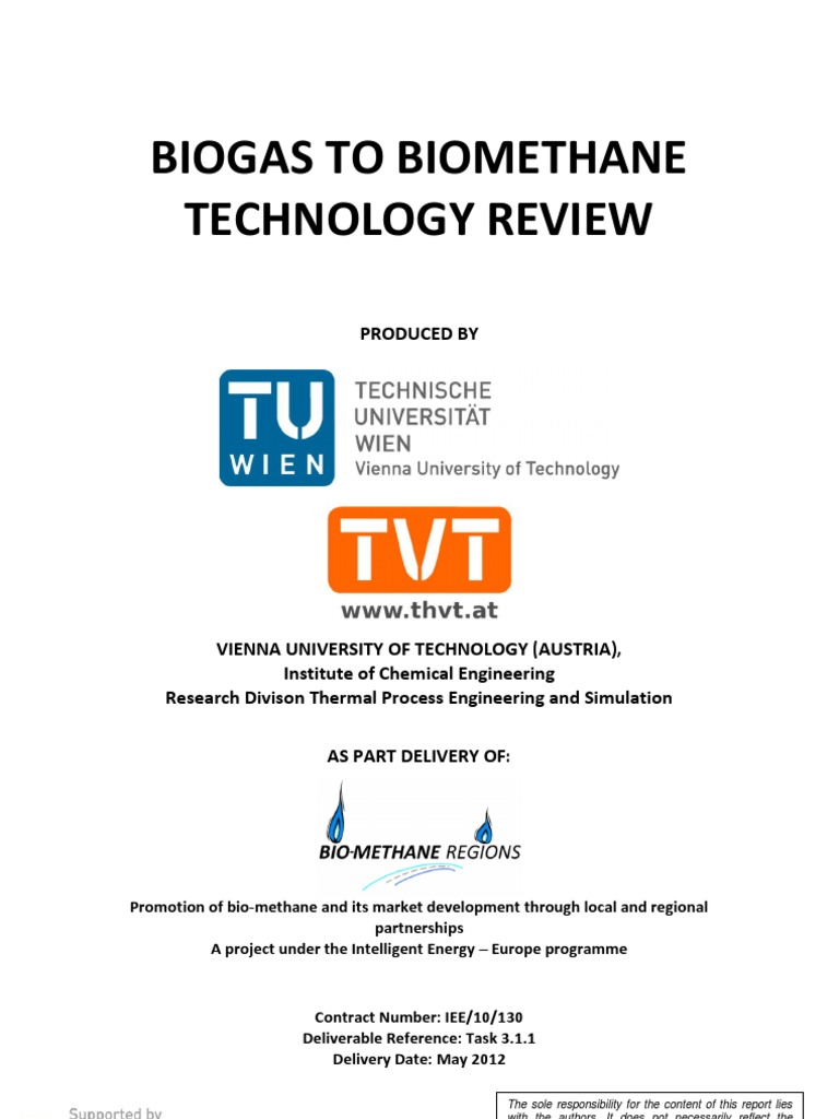 "Abschlussbericht Verbundprojekt Biogaseinspeisung, Band 4" Fraunhofer-Institut fuer Umwelt-, Sicherheits- und Energietechnik UMSICHT Urban, Lohmann, Girod; Germany, 2009 www.umsicht.fraunhofer.de "Biogas upgrading technologies - developments and innovations" IEA Bioenergy Task 37 - Energy from biogas and landfill gas Peterson, Wellinger; Sweden & Switzerland, 2009 www.iea-biogas.net "Biogas upgrading to vehicle fuel standards and grid injection" IEA Bioenergy Task 37 - Energy from biogas and landfill gas Persson, Jnsson, Wellinger; Sweden & Switzerland, 2006 www.iea-biogas.net "Biogas upgrading and utilisation" IEA Bioenergy Task 24 - Energy from biological conversion of organic waste Lindberg, Wellinger; Sweden & Switzerland, 2006 www.iea-biogas.net "Techniques for transformation of biogas to biomethane" Biomass and Bioenergy 35 (2011) 1633-1645 Ryckebosch, Drouillon, Vervaeren; 2011 www.journals.elsevier.com/biomass-and-bioenergy "Membrane biogas upgrading processes for the production of natural gas substitute" Separation and Purification Technology 74 (2010) 8392 Makaruk, Miltner, Harasek; 2010 www.journals.elsevier.com/separation-and-purification-technology "Chemical-oxidative scrubbing for the removal of hydrogen sulphide from raw biogas: potentials and economics" Water Science and Technology (2012) to be published Miltner, Makaruk, Krischan, Harasek; 2012 www.iwaponline.com/wst/default.htm