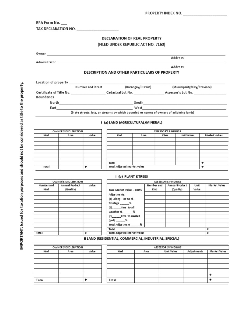 PROPERTY INDEX NO. _____________________ RPA Form No. ___ TAX DECLARATION NO.