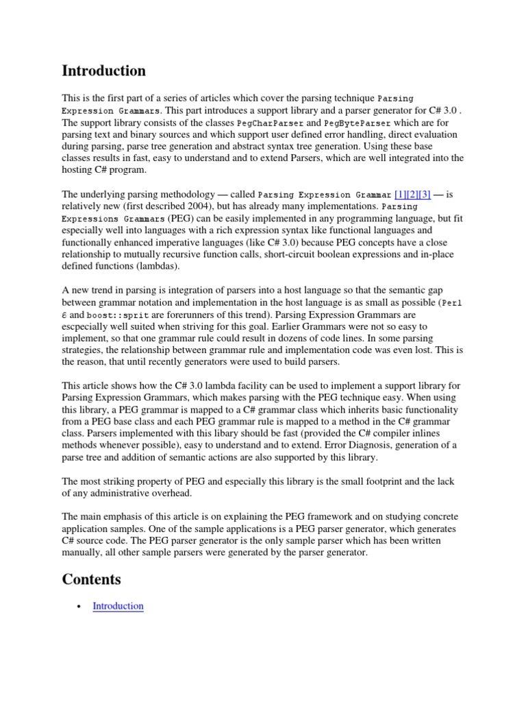 The planned series of articles consists of the following parts Subject Parser and Parser Generator PEGDebugger/Interpreter Sample Applications Planned Release date october 2008 january 2009 june 2009 Description C# classes to support work with Parsing expression grammars Direct interpretation and debugging of PEG grammars without need to generate C# module More grammar samples with postprocessing