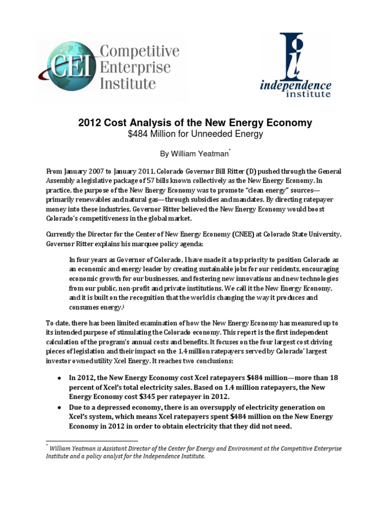 In 2012, the New Energy Economy cost Xcel ratepayers $484 millionmore than 18 percent of Xcels total electricity sales. Based on 1.4 million ratepayers, the New Energy Economy cost $345 per ratepayer in 2012. Due to a depressed economy, there is an oversupply of electricity generation on Xcels system, which means Xcel ratepayers spent $484 million on the New Energy Economy in 2012 in order to obtain electricity that they did not need.