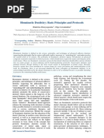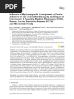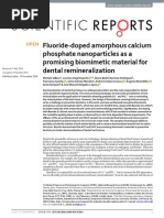 The fluorine is the catalysts of the calcium phosphate formation, promoting the reactions of Ca2+ with PO43- even at reagent concentration up to 5 times lower14. The results have indicated the deposition of a thicker layer on the oral surface of the tooth when compared to the others. Dentistry 3. Results and Discussion radiographic images revealed no significant difference on radiopacity With this surface treatment technique, important synthesis pabetween the new grown layer and tooth enamel suggesting a similar rameters were modified to obtain a thicker calcium phosphate grown density as showed in Figure 3. The SEM photomicrograph from crosslayer with simultaneous reduction on the deposition time. section of the same sample (Figure 3) is presented in Figure 4. The most probable reactions of the F-HA paste (Equation 2, A shiny surface (not showed) was observed after polishing, similar Equation 3 and Equation 4) that are likely to occur are similar to to the natural enamel. The F-HA deposited layer has adhered firmly to the tooth enamel surface, even when some mechanical stress for those generally found on the conventional acid etch to the enamel separation is applied or tooth fracture is performed in the samples, as follows14: suggesting a strong chemical interaction at the interface. These results + 2+ Ca10 (PO 4 )6 (OH)2(s) 2 H 3 Ca 3 (PO 4 )2(s) + Ca (aq) + H 2 O + 1/2are2 in agreement with some previously similar reports in the litera O (2) ture3, where synthetic apatite was used for rapid dental repair. HA We have demonstrated that the investigated process can be useful 2+ 3 Ca 3 (PO 4 )2(s) + Ca (aq) + H 2 O + 1/2 O2 by constructing synthetic enamel for dentistry applications. This synthetic F-HA paste can reconstruct enamel in a process that not only repairs early carie lesions but can also help to prevent their recur+ Ca 3 (PO 4 )2(s) 2H 2 CaHPO 4 + Ca 2+(Aq) rence by strengthening the natural enamel with the fluorine presence3. (3) Furthermore, other potential applications like whitening, where the TCP paste promotes a whitening of the human tooth surface due to the use of hydrogen peroxide, orthodontic accessories adhesion by creating 5 CaHPO 4 + H 2 O Ca 5 (PO 4 )3 (OH)(s) + 2 H3PO 4 + (4) O H2 a layer that protect the enamel of HA dissolution and promoting a new surface of adhesion, and protection of the enamel at restoration (PO 4 )3 (OH)(s) + 2 H3PO 4 + H 2 O cavity walls from recurrent of carie lesions and sealing of grooves, pits and fissures in deciduous and permanent teeth. Therefore, from Equation 2, the proposed reactions of fluorine The HA synthesis via wet route was previously studied by our with enamel14 are presented in Equation 5: research group9 in order to produce and extensively characterize the several possibilities of obtaining calcium phosphates for biomedical (5) application. In addition, some attention has been paid to the fact that it should be not only technically viable but also it has to be feasible to most common resources usually found in clinical and chemical
