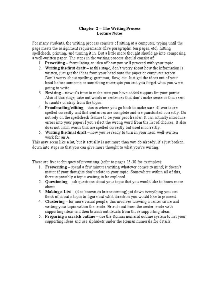 , typing until the page meets the assignment requirements (five paragraphs, ten pages, etc), hitting spellcheck, printing, and turning it in. But a little more thought should go into composing a well-written paper. The steps in the writing process should consist of: 1. Prewriting formulating an idea of how you will proceed with your topic 2. Writing the first draft at this stage, dont worry about how the information is written, just get the ideas from your head onto the paper or computer screen. Dont worry about spelling, grammar, flow, etc. Just get the ideas out of your head before someone or something interrupts you and you forget what you were going to write. 3. Revising now its time to make sure you have added support for your points. Also at this stage, take out words or sentences that dont make sense or that seem to ramble or stray from the topic. 4. Proofreading/editing this is where you go back to make sure all words are spelled correctly and that sentences are complete and are punctuated correctly. Do not rely on the spellcheck feature to be your proofreader. It can actually introduce errors into your paper if you select the wrong word from the list of choices. It also does not catch words that are spelled correctly but used incorrectly. 5. Writing the final draft now youre ready to turn in your neat, well-written work for an A. This may seem like a lot, but it actually is not more than you do already; its just broken down into steps so that you can give more thought to what youre writing. There are five techniques of prewriting (refer to pages 23-30 for examples): 1. Freewriting spend a few minutes writing whatever comes to mind; it doesnt matter if your thoughts dont relate to your topic. Somewhere within all of this, there is possibly a topic waiting to be explored. 2. Questioning ask questions about your topic that you would like to know more about. 3. Making a List (also known as brainstorming) jot down everything you can think of about a topic to figure out what direction you would like to proceed. 4. Clustering for more visual people, this involves drawing a center circle and writing your topic within the circle. Branch out from the center circle with supporting ideas and then branch out details from those supporting ideas. 5. Preparing a scratch outline use the Roman numeral outline system to list your supporting ideas and use alphabets under the Roman numerals for details.