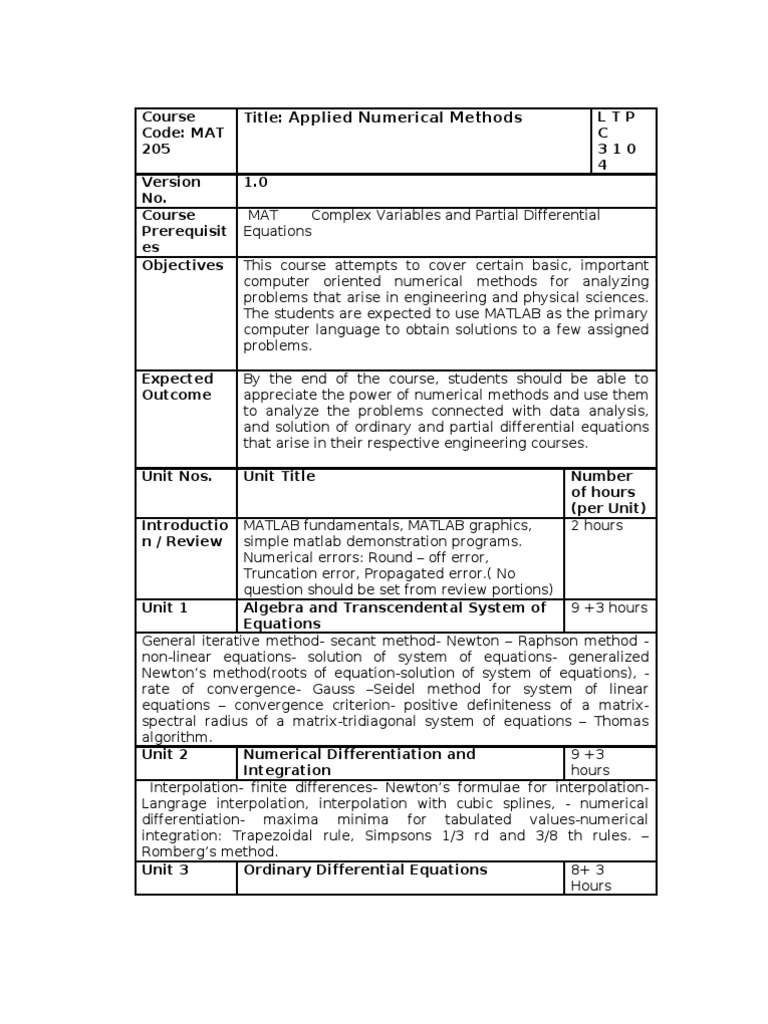 1.0 MAT Complex Variables and Partial Differential Equations This course attempts to cover certain basic, important computer oriented numerical methods for analyzing problems that arise in engineering and physical sciences. The students are expected to use MATLAB as the primary computer language to obtain solutions to a few assigned problems. By the end of the course, students should be able to appreciate the power of numerical methods and use them to analyze the problems connected with data analysis, and solution of ordinary and partial differential equations that arise in their respective engineering courses. Unit Title Number of hours (per Unit) 2 hours