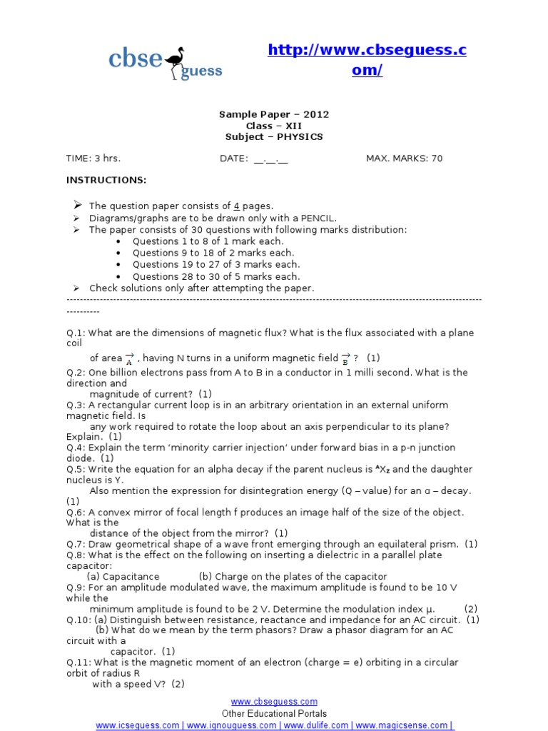 Sample Paper 2012 Class XII Subject PHYSICS TIME: 3 hrs. INSTRUCTIONS: The question paper consists of 4 pages. Diagrams/graphs are to be drawn only with a PENCIL. The paper consists of 30 questions with following marks distribution: Questions 1 to 8 of 1 mark each. Questions 9 to 18 of 2 marks each. Questions 19 to 27 of 3 marks each. Questions 28 to 30 of 5 marks each. Check solutions only after attempting the paper. -------------------------------------------------------------------------------------------------------------------------------------Q.1: What are the dimensions of magnetic flux? What is the flux associated with a plane coil of area , having N turns in a uniform magnetic field ? (1) Q.2: One billion electrons pass from A to B in a conductor in 1 milli second. What is the direction and magnitude of current? (1) Q.3: A rectangular current loop is in an arbitrary orientation in an external uniform magnetic field. Is any work required to rotate the loop about an axis perpendicular to its plane? Explain. (1) Q.4: Explain the term minority carrier injection under forward bias in a p-n junction diode. (1) Q.5: Write the equation for an alpha decay if the parent nucleus is AXZ and the daughter nucleus is Y. Also mention the expression for disintegration energy (Q value) for an decay. (1) Q.6: A convex mirror of focal length f produces an image half of the size of the object. What is the distance of the object from the mirror? (1) Q.7: Draw geometrical shape of a wave front emerging through an equilateral prism. (1) Q.8: What is the effect on the following on inserting a dielectric in a parallel plate capacitor: (a) Capacitance (b) Charge on the plates of the capacitor Q.9: For an amplitude modulated wave, the maximum amplitude is found to be 10 V while the minimum amplitude is found to be 2 V. Determine the modulation index . (2) Q.10: (a) Distinguish between resistance, reactance and impedance for an AC circuit. (1) (b) What do we mean by the term phasors? Draw a phasor diagram for an AC circuit with a capacitor. (1) Q.11: What is the magnetic moment of an electron (charge = e) orbiting in a circular orbit of radius R with a speed V? (2) www.cbseguess.com Other Educational Portals www.icseguess.com | www.ignouguess.com | www.dulife.com | www.magicsense.com | www.niosguess.com | www.iitguess.com DATE: __.__.__ MAX. MARKS: 70
