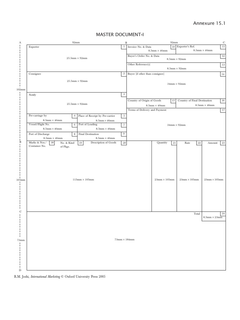 A Exporter 92mm 1 B Invoice No. & Data 8.5mm 46mm Buyers Order No. & Data 8.5mm 92mm Other Reference(s) 8.5mm 92mm Consignee 25.5mm 92mm 102mm Notify 25.5mm 92mm 3 Country of Origin of Goods 8.5mm 40mm Terms of Delivery and Payment Pre-carriage by 8.5mm 46mm Vessel/Flight No. 8.5mm 46mm Port of Discharge 8.5mm 46mm B Marks & Nos./ Container No. 18 No. & Kind of Pkgs. 19 8 6 4 Place of Receipt by Pre-carrier 8.5mm 46mm Port of Loading 8.5mm 46mm Final Destination 8.5mm 46mm Description of Goods 20 Quantity 21 Rate 22 Amount 23 9 5 7 34mm 92mm 15 Country of Final Destination 8.5mm 46mm 17 16 2 Buyer (if other than consignee) 34mm 92mm 14 92mm 10 Exporters Ref. 8.5mm 46mm C 11 12 13