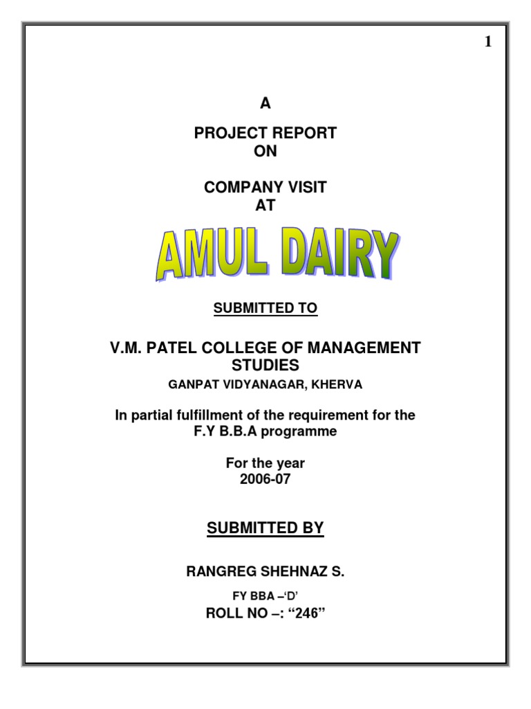 This project report has been prepared as a part of curriculum of the first year B.B.A programme. Here we are required to do an INDUSTRIAL VISIT of a particular company and prepare a project report on the same in the subject so called Growth and structure of industries. This blend of practical studies with theory makes study more interesting and full of knowledgeable information. We have visited an AMUL PVT. LTD and I have prepared a project report on the same. The purpose behind industrial visit and preparation of project report is to study the particular company from the view point of its history and development and functional departments like production department, marketing department, human resource department and financial department. The project report starts with the background and general information of the AMUL PVT. LTD and consists of information regarding its functional departments like production department, marketing department, human resource department and financial department.
