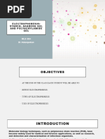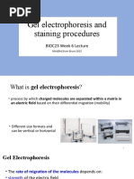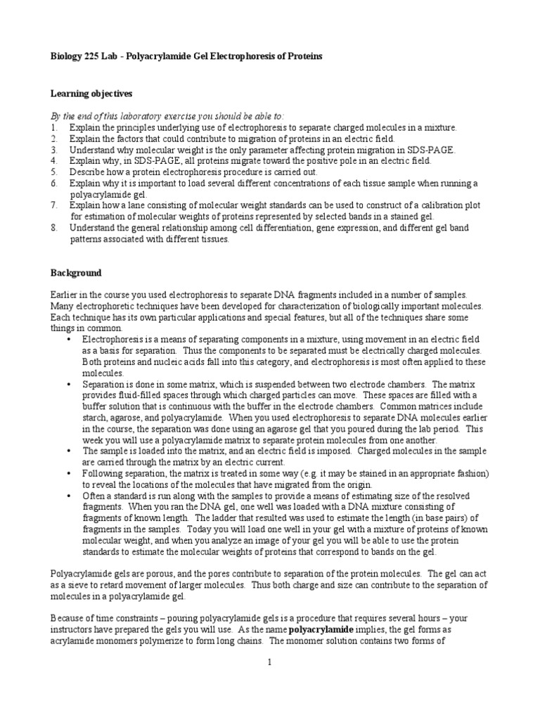 Learning objectives By the end of this laboratory exercise you should be able to: 1. Explain the principles underlying use of electrophoresis to separate charged molecules in a mixture. 2. Explain the factors that could contribute to migration of proteins in an electric field. 3. Understand why molecular weight is the only parameter affecting protein migration in SDS-PAGE. 4. Explain why, in SDS-PAGE, all proteins migrate toward the positive pole in an electric field. 5. Describe how a protein electrophoresis procedure is carried out. 6. Explain why it is important to load several different concentrations of each tissue sample when running a polyacrylamide gel. 7. Explain how a lane consisting of molecular weight standards can be used to construct of a calibration plot for estimation of molecular weights of proteins represented by selected bands in a stained gel. 8. Understand the general relationship among cell differentiation, gene expression, and different gel band patterns associated with different tissues. Background Earlier in the course you used electrophoresis to separate DNA fragments included in a number of samples. Many electrophoretic techniques have been developed for characterization of biologically important molecules. Each technique has its own particular applications and special features, but all of the techniques share some things in common. Electrophoresis is a means of separating components in a mixture, using movement in an electric field as a basis for separation. Thus the components to be separated must be electrically charged molecules. Both proteins and nucleic acids fall into this category, and electrophoresis is most often applied to these molecules. Separation is done in some matrix, which is suspended between two electrode chambers. The matrix provides fluid-filled spaces through which charged particles can move. These spaces are filled with a buffer solution that is continuous with the buffer in the electrode chambers. Common matrices include starch, agarose, and polyacrylamide. When you used electrophoresis to separate DNA molecules earlier in the course, the separation was done using an agarose gel that you poured during the lab period. This week you will use a polyacrylamide matrix to separate protein molecules from one another. The sample is loaded into the matrix, and an electric field is imposed. Charged molecules in the sample are carried through the matrix by an electric current. Following separation, the matrix is treated in some way (e.g. it may be stained in an appropriate fashion) to reveal the locations of the molecules that have migrated from the origin. Often a standard is run along with the samples to provide a means of estimating size of the resolved fragments. When you ran the DNA gel, one well was loaded with a DNA mixture consisting of fragments of known length. The ladder that resulted was used to estimate the length (in base pairs) of fragments in the samples. Today you will load one well in your gel with a mixture of proteins of known molecular weight, and when you analyze an image of your gel you will be able to use the protein standards to estimate the molecular weights of proteins that correspond to bands on the gel. Polyacrylamide gels are porous, and the pores contribute to separation of the protein molecules. The gel can act as a sieve to retard movement of larger molecules. Thus both charge and size can contribute to the separation of molecules in a polyacrylamide gel. Because of time constraints pouring polyacrylamide gels is a procedure that requires several hours your instructors have prepared the gels you will use. As the name polyacrylamide implies, the gel forms as acrylamide monomers polymerize to form long chains. The monomer solution contains two forms of