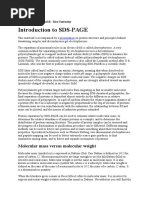 Several parameters contribute to the migration of protein molecules in an electric field. Small molecules move faster than do large molecules. Streamlined molecules move faster than do molecules with bulky shapes. Molecules with high charge density (charge to mass ratio) move faster than do molecules with low charge density. One common variation of PAGE is to include the detergent SDS in the buffers used to make the gel, to treat the sample, and to run the gel. In this variation (called SDS-PAGE), proteins separate on the basis of molecular weight alone. This is because the other two parameters are eliminated under the conditions used. The sample extract is heated to 95oC for 5 minutes in a treatment buffer that contains SDS. Heating break hydrogen bonds in the protein molecules, and another treatment buffer component reduces disulfide bonds (covalent bonds that contribute to protein three-dimensional structure). Thus the protein molecules lose their normal threedimensional shapes and unfold. SDS coats the unfolded protein molecules. This coating prevents the protein molecules from refolding and also masks the charges of the protein molecules. SDS itself has a negative charge, so the coated proteins will still migrate in an electric field. As a result of what happens when the proteins are treated in this fashion they all have the same streamlined shape and all have their own charges masked. With the same streamlined shape and the same charge density, the proteins differ from one another only in size, so size becomes the sole criterion for protein separation in an electric field. The treatment buffer also contains glycerol (which makes the sample dense) and a blue tracking dye (which allows you to follow the progress of electrophoresis).