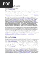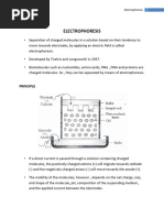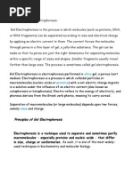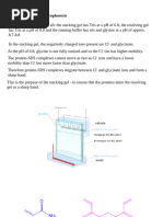 acrylamide; one forms short chains that that cross-links the longer chains that the other gives rise to, and the result is a three-dimensional network. The monomer solution is mixed with an appropriate buffer and a catalyst that promotes polymerization. Immediately after the mixture has been made, the liquid is poured into a mold in which the gel forms. The spaces in the three-dimensional polyacrylamide network are filled with buffer, and during electrophoresis the molecules being separated snake their way through these fluid-filled spaces. Depending on the application, the mold might be a cylindrical tube or a slab. You will be using a slab gel. The mold consists of a plain glass plate and a notched alumina plate. Two plastic spacers separate the plates. Within an hour after it has been poured into the mold, the acrylamide solution polymerizes, resulting in a sandwich: glass at one face, alumina at the other, and polyacrylamide in between. The specific recipe used for the acrylamide solution determines the pore size of the gel. A common approach employed in polyacrylamide gel electrophoresis (often referred to by the acronym PAGE) is the discontinuous system developed by Laemmli, and this is the approach you will use. The gel actually consists of two different gels, one poured atop the other. The lower gel is poured first. This gel, called the running gel or separating gel, is typically made from an acrylamide solution that is about 12% acrylamide. After the first gel has polymerized, the top gel is poured. This gel, called the stacking gel, is typically made from an acrylamide solution that is about 4% acrylamide. The stacking gel is more porous, so proteins migrate through it more quickly (and more uniformly, since a large pore gel has less of a sieving effect); as a result the proteins are condensed into a tight band before they enter the running gel. This allows for a sharper resolution of proteins within the running gel.