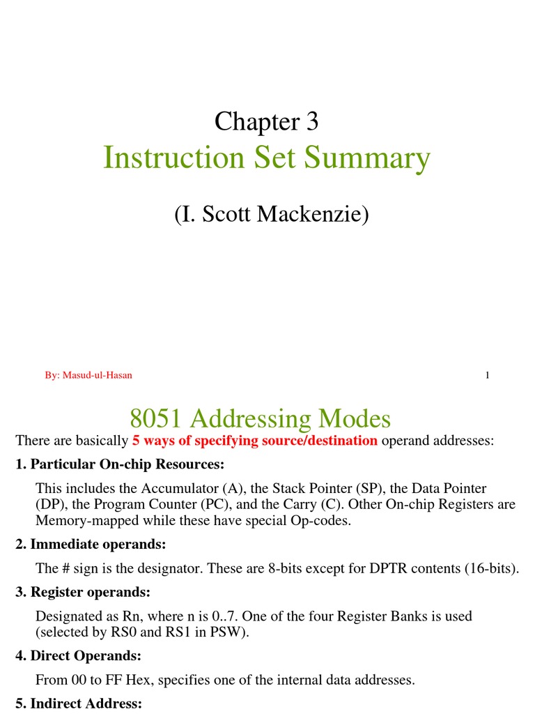 There are basically 5 ways of specifying source/destination operand addresses: 1. Particular On-chip Resources: This includes the Accumulator (A), the Stack Pointer (SP), the Data Pointer (DP), the Program Counter (PC), and the Carry (C). Other On-chip Registers are Memory-mapped while these have special Op-codes. 2. Immediate operands: The # sign is the designator. These are 8-bits except for DPTR contents (16-bits). 3. Register operands: Designated as Rn, where n is 0..7. One of the four Register Banks is used (selected by RS0 and RS1 in PSW). 4. Direct Operands: From 00 to FF Hex, specifies one of the internal data addresses. 5. Indirect Address: Designated as @Ri, where i is 0 or 1, uses the contents of R0 or R1 in the selected Register Bank to specify the address. Other form is @A, using Accumulator contents.