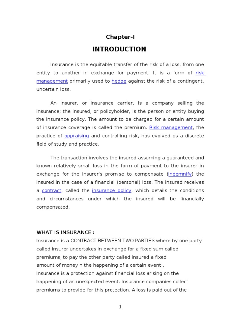 WHAT IS INSURANCE : Insurance is a CONTRACT BETWEEN TWO PARTIES where by one party called insurer undertakes in exchange for a fixed sum called premiums, to pay the other party called insured a fixed amount of money n the happening of a certain event . Insurance is a protection against financial loss arising on the happening of an unexpected event. Insurance companies collect premiums to provide for this protection. A loss is paid out of the 1