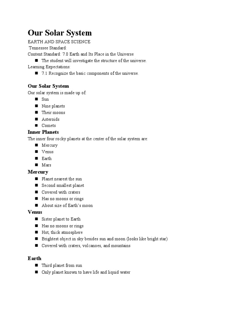EARTH AND SPACE SCIENCE Tennessee Standard: Content Standard: 7.0 Earth and Its Place in the Universe The student will investigate the structure of the universe. Learning Expectations: 7.1 Recognize the basic components of the universe.