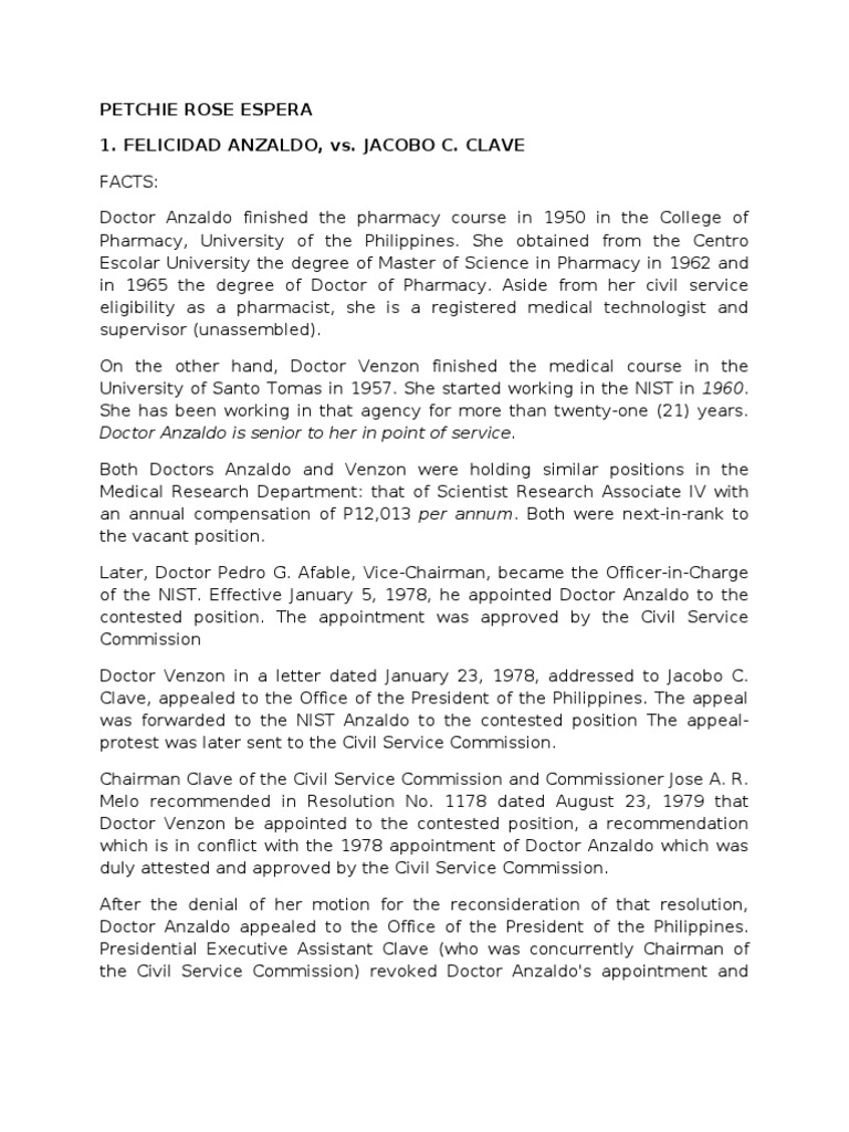 CLAVE FACTS: Doctor Anzaldo finished the pharmacy course in 1950 in the College of Pharmacy, University of the Philippines. She obtained from the Centro Escolar University the degree of Master of Science in Pharmacy in 1962 and in 1965 the degree of Doctor of Pharmacy. Aside from her civil service eligibility as a pharmacist, she is a registered medical technologist and supervisor (unassembled). On the other hand, Doctor Venzon finished the medical course in the University of Santo Tomas in 1957. She started working in the NIST in 1960. She has been working in that agency for more than twenty-one (21) years. Doctor Anzaldo is senior to her in point of service. Both Doctors Anzaldo and Venzon were holding similar positions in the Medical Research Department: that of Scientist Research Associate IV with an annual compensation of P12,013 per annum. Both were next-in-rank to the vacant position. Later, Doctor Pedro G. Afable, Vice-Chairman, became the Officer-in-Charge of the NIST. Effective January 5, 1978, he appointed Doctor Anzaldo to the contested position. The appointment was approved by the Civil Service Commission Doctor Venzon in a letter dated January 23, 1978, addressed to Jacobo C. Clave, appealed to the Office of the President of the Philippines. The appeal was forwarded to the NIST Anzaldo to the contested position The appealprotest was later sent to the Civil Service Commission. Chairman Clave of the Civil Service Commission and Commissioner Jose A. R. Melo recommended in Resolution No. 1178 dated August 23, 1979 that Doctor Venzon be appointed to the contested position, a recommendation which is in conflict with the 1978 appointment of Doctor Anzaldo which was duly attested and approved by the Civil Service Commission. After the denial of her motion for the reconsideration of that resolution, Doctor Anzaldo appealed to the Office of the President of the Philippines. Presidential Executive Assistant Clave (who was concurrently Chairman of the Civil Service Commission) revoked Doctor Anzaldo's appointment and