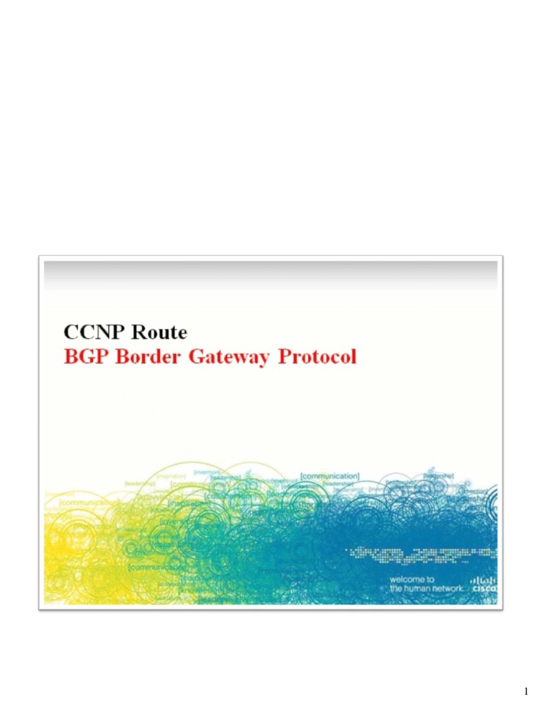 Border Gateway Protocol Used to exchange routes/prefix between different autonomous systems (AS) Use TCP port 179 Require IGP, network cant route with only BGP Only one process per router Need neighbors but doesnt run on interfaces Neighbors doesnt need to be directly connected iBGP: In the same AS (AD 200) eBGP: In different AS (AD 20) Hello 60 seconds / Dead 180 seconds BGP Autonomous System Set of routers under a unique technical administration AS range: Public: 1 64511 Private: 64512 65535