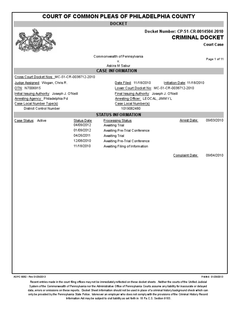 Cross Court Docket Nos: MC-51-CR-0038712-2010 Judge Assigned: Wogan, Chris R. OTN: N7006915 Initial Issuing Authority: Joseph J. O'Neill Arresting Agency: Philadelphia Pd Case Local Number Type(s) District Control Number Case Status: Active Status Date 04/09/2012 01/09/2012 04/26/2011 12/08/2010 11/18/2010 Date Filed: 11/18/2010 Initiation Date: 11/18/2010 Lower Court Docket No: MC-51-CR-0038712-2010 Final Issuing Authority: Joseph J. O'Neill Arresting Officer: LEOCAL, JIMMY L Case Local Number(s) 1019082480