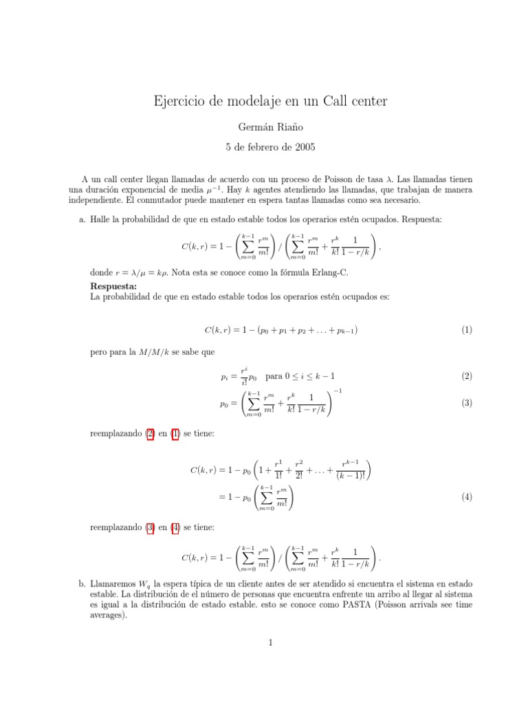 A un call center llegan llamadas de acuerdo con un proceso de Poisson de tasa . Las llamadas tienen una duracin exponencial de media 1 . Hay k agentes atendiendo las llamadas, que trabajan de manera o independiente. El conmutador puede mantener en espera tantas llamadas como sea necesario. a. Halle la probabilidad de que en estado estable todos los operarios estn ocupados. Respuesta: e C(k, r) = 1 rm m! m=0