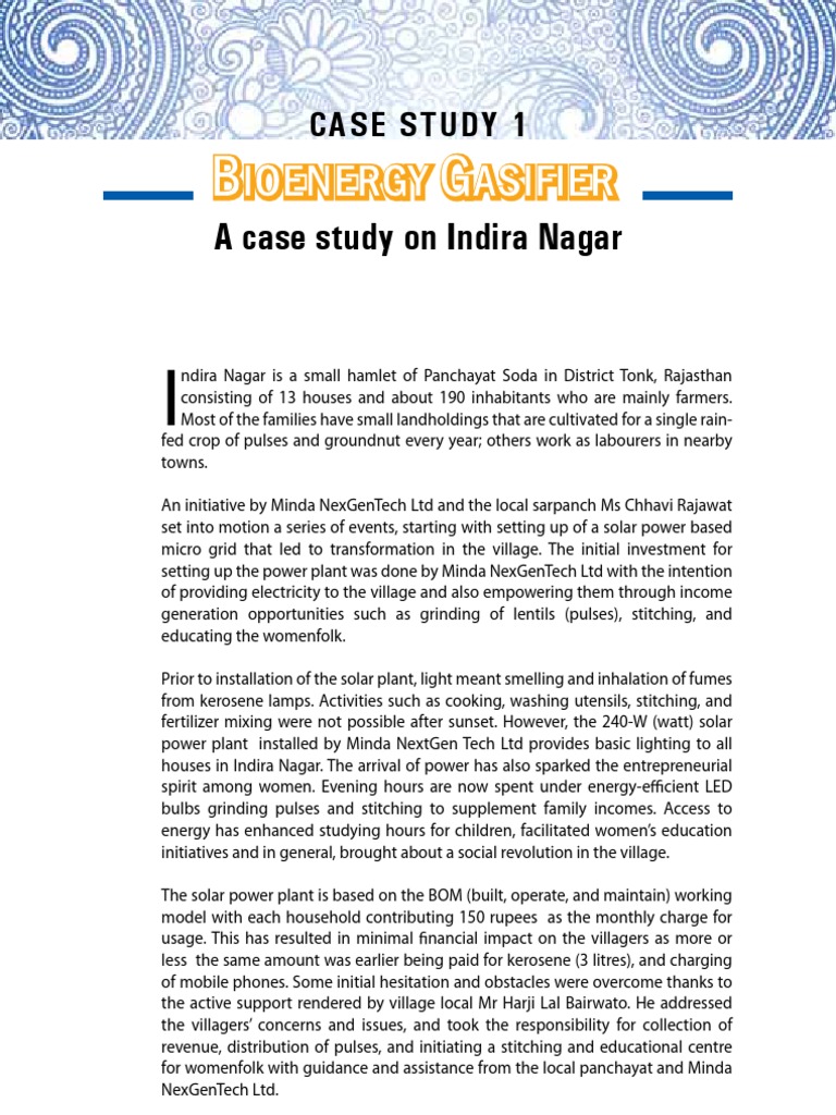 ndira Nagar is a small hamlet of Panchayat Soda in District Tonk, Rajasthan consisting of 13 houses and about 190 inhabitants who are mainly farmers. Most of the families have small landholdings that are cultivated for a single rainfed crop of pulses and groundnut every year; others work as labourers in nearby towns. An initiative by Minda NexGenTech Ltd and the local sarpanch Ms Chhavi Rajawat set into motion a series of events, starting with setting up of a solar power based micro grid that led to transformation in the village. The initial investment for setting up the power plant was done by Minda NexGenTech Ltd with the intention of providing electricity to the village and also empowering them through income generation opportunities such as grinding of lentils (pulses), stitching, and educating the womenfolk. Prior to installation of the solar plant, light meant smelling and inhalation of fumes from kerosene lamps. Activities such as cooking, washing utensils, stitching, and fertilizer mixing were not possible after sunset. However, the 240-W (watt) solar power plant installed by Minda NextGen Tech Ltd provides basic lighting to all houses in Indira Nagar. The arrival of power has also sparked the entrepreneurial spirit among women. Evening hours are now spent under energy-efficient LED bulbs grinding pulses and stitching to supplement family incomes. Access to energy has enhanced studying hours for children, facilitated womens education initiatives and in general, brought about a social revolution in the village. The solar power plant is based on the BOM (built, operate, and maintain) working model with each household contributing 150 rupees as the monthly charge for usage. This has resulted in minimal financial impact on the villagers as more or less the same amount was earlier being paid for kerosene (3 litres), and charging of mobile phones. Some initial hesitation and obstacles were overcome thanks to the active support rendered by village local Mr Harji Lal Bairwato. He addressed the villagers concerns and issues, and took the responsibility for collection of revenue, distribution of pulses, and initiating a stitching and educational centre for womenfolk with guidance and assistance from the local panchayat and Minda NexGenTech Ltd.
