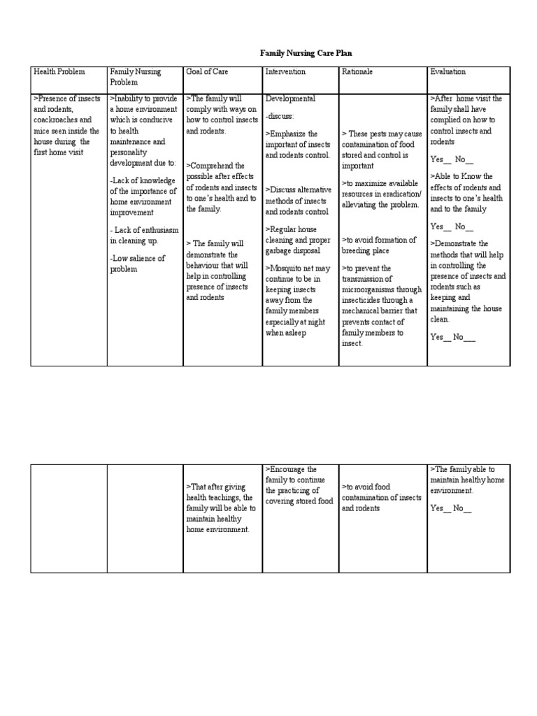 Family Nursing Care Plan Health Problem >Presence of insects and rodents, coackroaches and mice seen inside