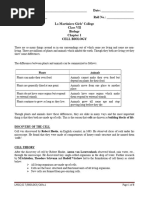 o Cell membrane selectively allows the entry of only some substances and prevents the movement of other materials. Hence, it checks the transport of substances in and out of the cell. Cell wall o In plants, an extra protective covering of a polysaccharide, cellulose is present. o It is called cell wall that protects plant cells from environmental variations. Cytoplasm o It is a jelly-like substance present between cell membrane and nucleus. o It contains various cell organelles such as mitochondria, Golgi bodies, lysosomes etc. Nucleus o It is a dense spherical body located at the centre of the cell. o It is surrounded by porous nuclear membrane. o It contains spherical body called nucleolus. o It also contains thread-like structures called chromosomes. o Chromosomes are the structures that carry genes and play an important role in inheritance. o Genes are the structural and functional unit of inheritance. o The entire living substance in a cell is known as protoplast. Vacuoles o Vacuoles are fluid-filled membrane-bound structures in the cell. o In plant cells, a single large vacuole is present. o In animal cells, numerous small vacuoles are present. Plastids o They are present only in plant cells. o Plastid that contains green colour pigment called chlorophyll is known as chloroplasts. It is the chlorophyll that gives green colour to the leaves. o Chloroplast traps solar energy and utilizes this energy to manufacture food for the plant. Types of cell Prokaryotic cells - Cells having nuclear material without well defined nuclear membrane. For example - bacteria, blue green algae Eukaryotic cells - Cells having nucleus with well defined nuclear membrane. For example - plant and animal cells Differences between plant and animal cells Plant cell o Cell wall is present.