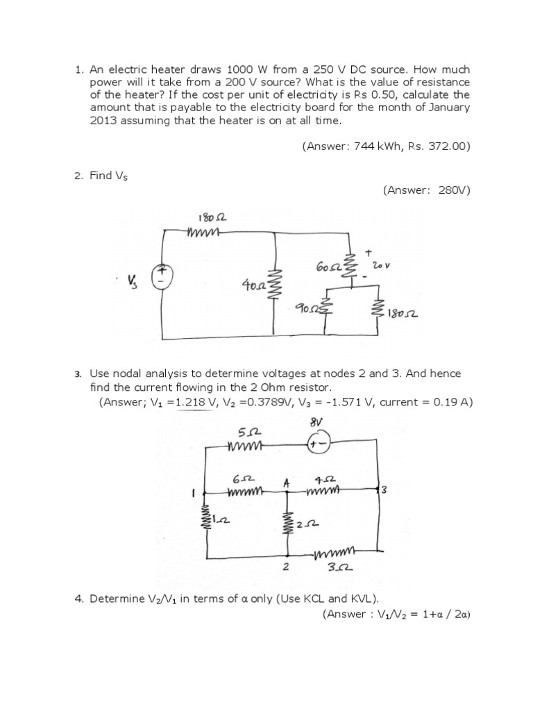 1. An electric heater draws 1000 W from a 250 V DC source. How much power will it take from a 200 V source?