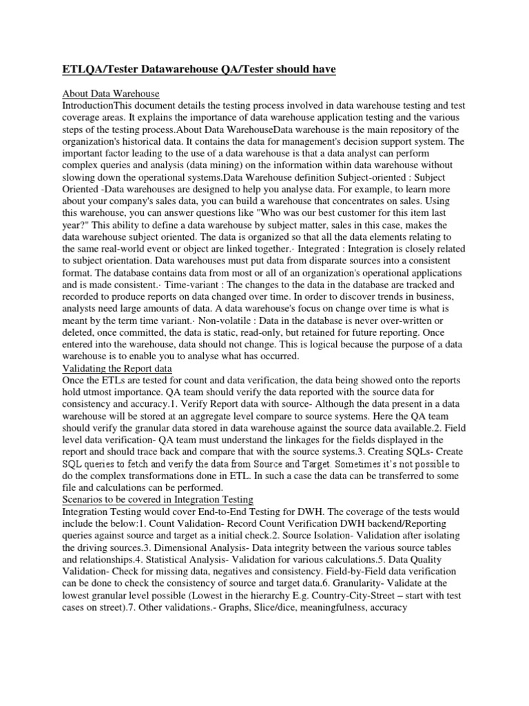 About Data Warehouse IntroductionThis document details the testing process involved in data warehouse testing and test coverage areas. It explains the importance of data warehouse application testing and the various steps of the testing process.About Data WarehouseData warehouse is the main repository of the organization's historical data. It contains the data for management's decision support system. The important factor leading to the use of a data warehouse is that a data analyst can perform complex queries and analysis (data mining) on the information within data warehouse without slowing down the operational systems.Data Warehouse definition Subject-oriented : Subject Oriented -Data warehouses are designed to help you analyse data. For example, to learn more about your company's sales data, you can build a warehouse that concentrates on sales. Using this warehouse, you can answer questions like "Who was our best customer for this item last year?" This ability to define a data warehouse by subject matter, sales in this case, makes the data warehouse subject oriented. The data is organized so that all the data elements relating to the same real-world event or object are linked together. Integrated : Integration is closely related to subject orientation. Data warehouses must put data from disparate sources into a consistent format. The database contains data from most or all of an organization's operational applications and is made consistent. Time-variant : The changes to the data in the database are tracked and recorded to produce reports on data changed over time. In order to discover trends in business, analysts need large amounts of data. A data warehouse's focus on change over time is what is meant by the term time variant. Non-volatile : Data in the database is never over-written or deleted, once committed, the data is static, read-only, but retained for future reporting. Once entered into the warehouse, data should not change. This is logical because the purpose of a data warehouse is to enable you to analyse what has occurred. Validating the Report data Once the ETLs are tested for count and data verification, the data being showed onto the reports hold utmost importance. QA team should verify the data reported with the source data for consistency and accuracy.1. Verify Report data with source- Although the data present in a data warehouse will be stored at an aggregate level compare to source systems. Here the QA team should verify the granular data stored in data warehouse against the source data available.2. Field level data verification- QA team must understand the linkages for the fields displayed in the report and should trace back and compare that with the source systems.3. Creating SQLs- Create SQL queries to fetch and verify the data from Source and Target. Sometimes its not possible to do the complex transformations done in ETL. In such a case the data can be transferred to some file and calculations can be performed. Scenarios to be covered in Integration Testing Integration Testing would cover End-to-End Testing for DWH. The coverage of the tests would include the below:1. Count Validation- Record Count Verification DWH backend/Reporting queries against source and target as a initial check.2. Source Isolation- Validation after isolating the driving sources.3. Dimensional Analysis- Data integrity between the various source tables and relationships.4. Statistical Analysis- Validation for various calculations.5. Data Quality Validation- Check for missing data, negatives and consistency. Field-by-Field data verification can be done to check the consistency of source and target data.6. Granularity- Validate at the lowest granular level possible (Lowest in the hierarchy E.g. Country-City-Street start with test cases on street).7. Other validations.- Graphs, Slice/dice, meaningfulness, accuracy