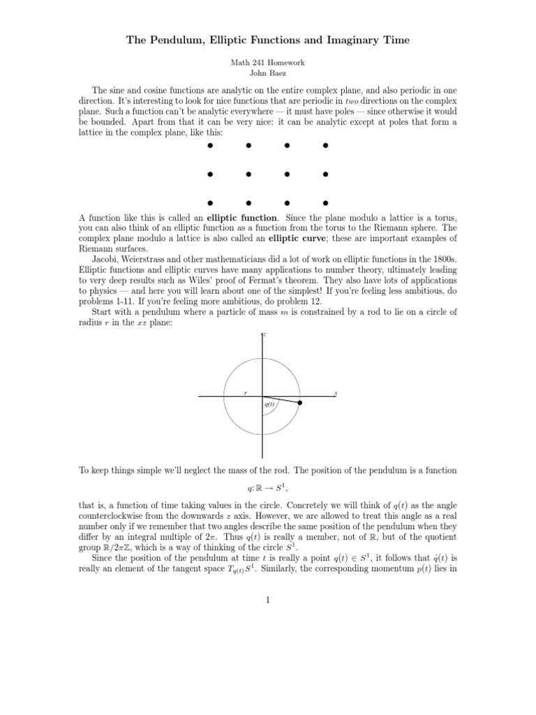 d d d sn(t, k) = cn(t, k)dn(t, k) cn(t, k) = sn(t, k)dn(t, k) dn(t, k) = k 2 sn(t, k)cn(t, k), dt dt dt so before you know it, youve got a whole world of generalized trig formulas on your hands! Back in the 1800s, any decent mathematician would know this stu. You should too. But now for the really cool part: 10. Using part 5, show that q(t) and thus sn(t, k) is periodic as a function of t. 11. Show that making the replacement t it in Newtons law is equivalent to reversing the sign of all forces. In the present problem, this amounts to reversing the force of gravity, making it pull the pendulum up. But an upside-down pendulum is just another pendulum. Therefore the function sn(it, k) must also be periodic as a function of t. This suggests that sn(z, k), as a function of z C, is periodic in both the real and imaginary directions. And its true! So, the pendulum gives a physical explanation of the fact that elliptic functions are periodic in two directions on the complex plane! 12. Prove, as rigorously as you can, that sn(z, k) is periodic in two directions. You can do this either by eshing out the above argument, or by studying the integral in equation (3) and worrying about those branch points. In fact we have sn(z + 4K, k) = sn(z, k), where for 0 < k < 1 K=