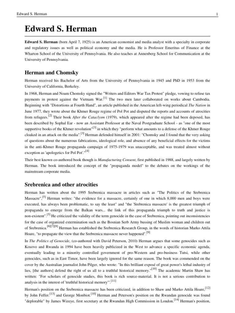 Edward S. Herman Source: [Link] Contributors: A.G. Pinkwater, AKeen, AaronSw, AccountInquiry, Adoniscik, Astuishin, Bdesham, Bobrayner, Bosniak, Davenbelle, Deodar, Derim Hunt, DocteurCosmos, Dysprosia, Edward, Enden, FC Toronto, FlutteringCarp, Gadfium, Happywith006, InverseHypercube, JayJasper, Jayron32, JohKar, John K, Johnpacklambert, Joseph Solis in Australia, Jrtayloriv, Keith-264, Klemen Kocjancic, Lapsed Pacifist, Laurusnobilis, LeeCorrie, LilHelpa, Lucobrat, Male1979, Mike Babic, Moorlock, NorsemanII, Omnipaedista, Osli73, Peppedeninno, Pgan002, Philip Cross, Pinkville, Pjchandler, RekishiEJ, Rich Farmbrough, Rolando, Santasa99, Style, Suranah, Tabletop, Tagishsimon, Tazmaniacs, TheParanoidOne, TheTimesAreAChanging, Trey Stone, Typing monkey, Vojvodaen, Waacstats, Zloyvolsheb, 39 anonymous edits