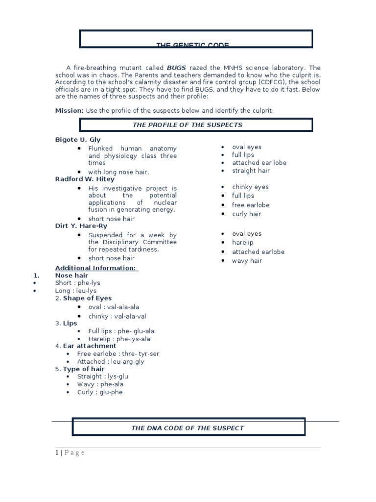 A fire-breathing mutant called BUGS razed the MNHS science laboratory. The school was in chaos. The Parents and teachers demanded to know who the culprit is. According to the schools calamity disaster and fire control group (CDFCG), the school officials are in a tight spot. They have to find BUGS, and they have to do it fast. Below are the names of three suspects and their profile: Mission: Use the profile of the suspects below and identify the culprit. THE PROFILE OF THE SUSPECTS Bigote U. Gly Flunked human anatomy and physiology class three times with long nose hair, Radford W. Hitey His investigative project is about the potential applications of nuclear fusion in generating energy. short nose hair Dirt Y. Hare-Ry Suspended for a week by the Disciplinary Committee for repeated tardiness. short nose hair 1. Additional Information: Nose hair Short : phe-lys Long : leu-lys 2. Shape of Eyes oval : val-ala-ala chinky : val-ala-val 3. Lips Full lips : phe- glu-ala Harelip : phe-lys-ala 4. Ear attachment Free earlobe : thre- tyr-ser Attached : leu-arg-gly 5. Type of hair Straight : lys-glu Wavy : phe-ala Curly : glu-phe oval eyes full lips attached ear lobe straight hair chinky eyes full lips free earlobe curly hair oval eyes harelip attached earlobe wavy hair