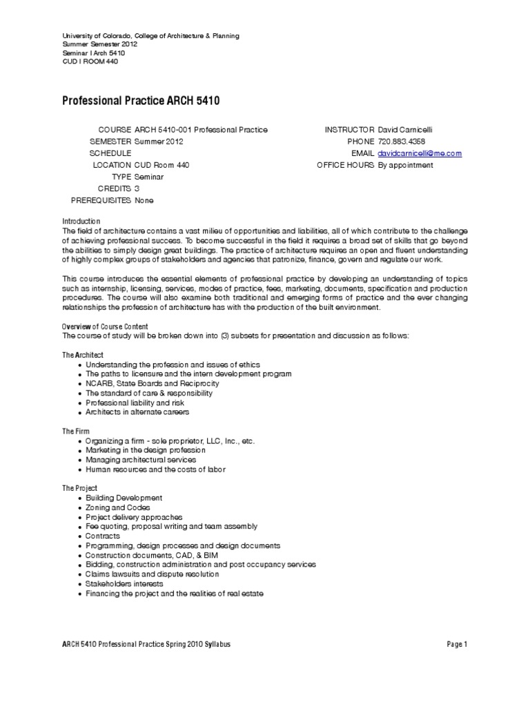 Course Work & Assignments Over the period of the semester the seminar will engage readings and case studies followed by detailed discussions in class. In addition to the required readings and case studies, there will be a series of lectures and panel discussions with the instructor and outside guests. For the semesters assignments, you will be required to produce several small written essay assignments, quizzes of the reading materials and a nal exam. You will also be required to conduct in groups (of 3-4 students) topic specic case studies and analysis and a rm interview and presentation to the class. The only required text will be: The Architecture Student's Handbook of Professional Practice. Wiley (October 27, 2008) (Be sure you get the most recent one based on the 14th edition of the professional handbook) This text is available through the AIA, local bookstores, and online. It should cost approximately $80.00 new. I will provide copies of several additional texts via the Blackboard site before the class it is due. It is your responsibility to obtain copies of the readings for your use. I also expect that readings are completed on the day of discussion and an adept understanding of the material is expressed through the dialogues that occur in the seminar. Active participation in these dialogues is mandatory and expected. This seminar is crammed with material and will be intense. We will have very informative and experienced guests and the information they have to share is critical to your growth as a practitioner. I expect you to be fully immersed and engaged. With that said, attendance during scheduled class time is imperative if you are to keep up with the seminar assignments. I expect that you will be in class at the start of class, stay in attendance until class is over and be attentive and engaged. Course Objectives & NAAB Criteria For Assessment Primary Performance Criteria: 01 Speaking and Writing Skills - Ability to read, write, listen, and speak effectively. 25 Construction Cost Control - Understanding of the basic principals and appropriate application and performance of building envelope materials and assemblies. 27 Client Role in Architecture - Understanding of the responsibility of the architect to elicit, understand, and resolve the needs of the client, owner, and user. 29 Architect's Administrative Roles - Understanding of obtaining commissions and negotiating contracts, managing personnel and selecting consultants, recommending project delivery methods, and forms of service contracts. 30 Architectural Practice - Understanding of the basic principles and the legal aspects of practice organization, nancial management, business planning, time and project management, risk mitigation, and mediation and arbitration as well as an understanding of trends that affect practice such as globalization, outsourcing project delivery, expanding practice settings, diversity and others. 31 Professional Development - Understanding of the role of internship, obtaining licensure and registration and the mutual rights and responsibilities of interns and employers. 32 Leadership - Understanding of the need for architects to provide leadership in the building design and construction processes and on issues of growth, development and the aesthetics in their communities. 33 Legal Responsibilities - Understanding of the architect's responsibility as determined by registration law, building codes and regulations, professional service contracts, zoning and subdivision ordinances, environmental regulation, historic preservation laws and accessibility laws.