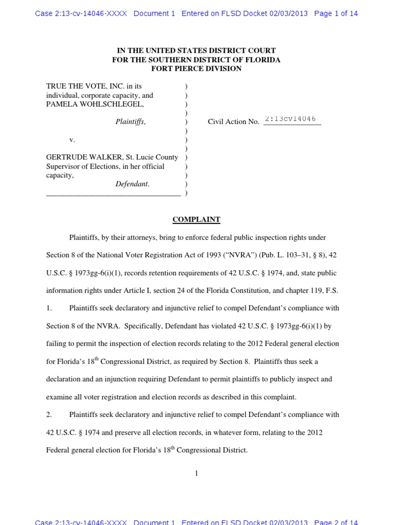 3 10. Defendant Gertrude Walker is the Supervisor of Elections in St. Lucie County. In that capacity, she is both the custodian of records sought by the plaintiffs to be preserved and inspected, as well as the administrator of elections in St. Lucie County. Defendant administered the general election in St. Lucie County for the 18