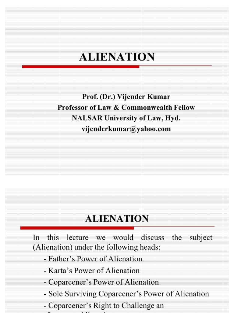 In this lecture we would discuss the subject (Alienation) under the following heads: - Fathers Power of Alienation - Kartas Power of Alienation - Coparceners Power of Alienation - Sole Surviving Coparceners Power of Alienation - Coparceners Right to Challenge an Improper Alienation - Alienees Right and Remedies
