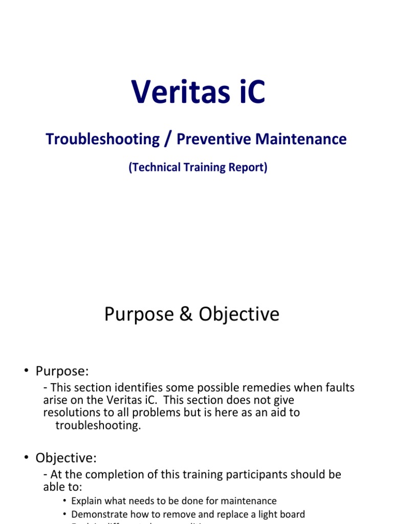 Explain what needs to be done for maintenance Demonstrate how to remove and replace a light board Explain different alarm conditions Follow the electrical drawings for the Veritas iC