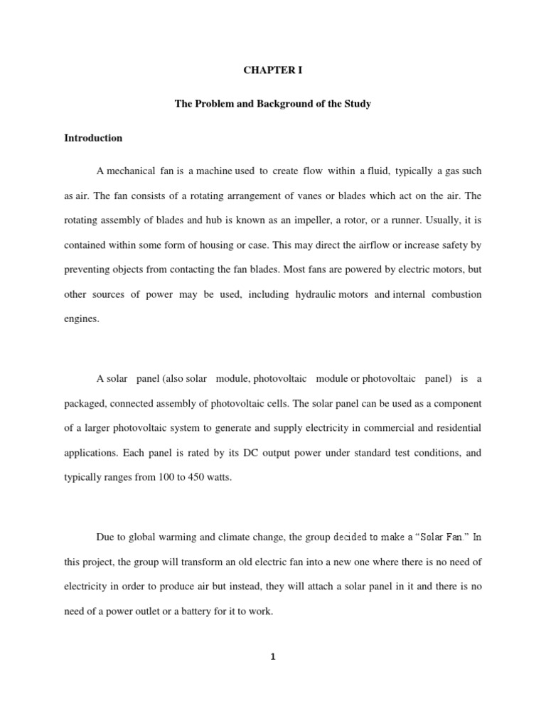 The Solar Fan, a research paper, explains how and why the researchers have come up with a unique and an eco friendly device that can be used in our daily lives, whenever and wherever they want to. The researchers main goal is to improve old appliances and transform it into new ones that will help our community during hot climates and weather. Aside from that, the study includes the procedures on how it is being done and also the materials that they are to use in making the product possible. With the facts presented from the books, internet and studies they have cited, those will help us learn more and explore things.