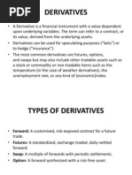 Characteristic of Derivatives Sophisticated, Dynamic Risk Management Instruments Types of Derivatives Forward: A customized, risk-exposed contract for a future trade Futures: A standardized, exchange-traded, daily-settled forward Swap: A multiple of forwards with periodic settlements Option: A forward synthesized with a risk-free asset Derivative, Dependent, Contingent, Conditional, Synthetic, Hybrid, Flexible, Dynamic, Adaptive, Proactive, Versatile, ...