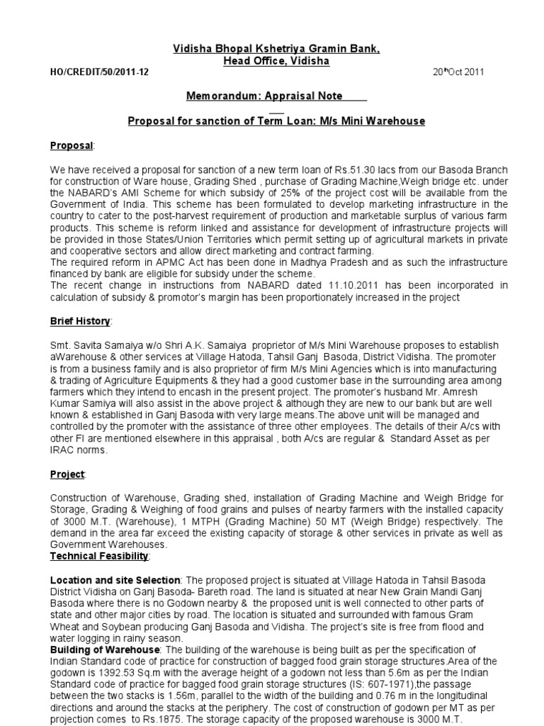 Proposal: We have received a proposal for sanction of a new term loan of Rs.51.30 lacs from our Basoda Branch for construction of Ware house, Grading Shed , purchase of Grading Machine,Weigh bridge etc. under the NABARDs AMI Scheme for which subsidy of 25% of the project cost will be available from the Government of India. This scheme has been formulated to develop marketing infrastructure in the country to cater to the post-harvest requirement of production and marketable surplus of various farm products. This scheme is reform linked and assistance for development of infrastructure projects will be provided in those States/Union Territories which permit setting up of agricultural markets in private and cooperative sectors and allow direct marketing and contract farming. The required reform in APMC Act has been done in Madhya Pradesh and as such the infrastructure financed by bank are eligible for subsidy under the scheme. The recent change in instructions from NABARD dated 11.10.2011 has been incorporated in calculation of subsidy & promotors margin has been proportionately increased in the project Brief History: Smt. Savita Samaiya w/o Shri A.K. Samaiya proprietor of M/s Mini Warehouse proposes to establish aWarehouse & other services at Village Hatoda, Tahsil Ganj Basoda, District Vidisha. The promoter is from a business family and is also proprietor of firm M/s Mini Agencies which is into manufacturing & trading of Agriculture Equipments & they had a good customer base in the surrounding area among farmers which they intend to encash in the present project. The promoters husband Mr. Amresh Kumar Samiya will also assist in the above project & although they are new to our bank but are well known & established in Ganj Basoda with very large means.The above unit will be managed and controlled by the promoter with the assistance of three other employees. The details of their A/cs with other FI are mentioned elsewhere in this appraisal , both A/cs are regular & Standard Asset as per IRAC norms. Project: Construction of Warehouse, Grading shed, installation of Grading Machine and Weigh Bridge for Storage, Grading & Weighing of food grains and pulses of nearby farmers with the installed capacity of 3000 M.T. (Warehouse), 1 MTPH (Grading Machine) 50 MT (Weigh Bridge) respectively. The demand in the area far exceed the existing capacity of storage & other services in private as well as Government Warehouses. Technical Feasibility: Location and site Selection: The proposed project is situated at Village Hatoda in Tahsil Basoda District Vidisha on Ganj Basoda- Bareth road. The land is situated at near New Grain Mandi Ganj Basoda where there is no Godown nearby & the proposed unit is well connected to other parts of state and other major cities by road. The location is situated and surrounded with famous Gram Wheat and Soybean producing Ganj Basoda and Vidisha. The projects site is free from flood and water logging in rainy season. Building of Warehouse: The building of the warehouse is being built as per the specification of Indian Standard code of practice for construction of bagged food grain storage structures.Area of the godown is 1392.53 Sq.m with the average height of a godown not less than 5.6m as per the Indian Standard code of practice for bagged food grain storage structures (IS: 607-1971),the passage between the two stacks is 1.56m, parallel to the width of the building and 0.76 m in the longitudinal directions and around the stacks at the periphery. The cost of construction of godown per MT as per projection comes to Rs.1875. The storage capacity of the proposed warehouse is 3000 M.T.
