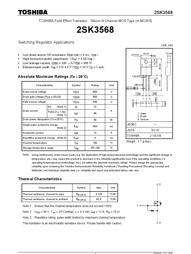 Note 1: Ensure that the channel temperature does not exceed 150. Note 2: VDD = 90 V, Tch = 25C(initial), L = 4.3 mH, IAR = 12 A, RG = 25 Note 3: Repetitive rating: pulse width limited by maximum channel temperature This transistor is an electrostatic-sensitive device. Please handle with caution.
