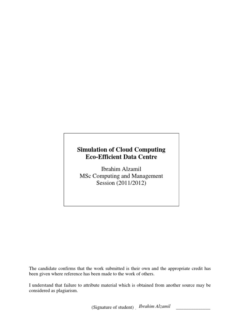 Abstract ............................................................................................................... Acknowledgement ...................................................................................... List of Acronyms ................................................................................................... List of Figures ................................................................................................... List of Tables ................................................................................................... Table of Contents ................................................................................................... 1. Introduction ................................................................................................... 1.1. Overview .......................................................................................................... 1.2. Aim and Objectives ............................................................................................. 1.3. Minimum Requirements and Further Enhancements ......................................... 1.4. Deliverables .......................................................................................................... 1.5. Motives and Relevance to the Degree Programme ......................................... 1.6. Methodology .......................................................................................................... 1.7. Initial Project Plan ............................................................................................. [Link] Activities ............................................................................................. [Link] ............................................................................................. 2. Review of Literature and Technologies .............................................................. 2.1. Introduction to Cloud Computing ................................................................... [Link] is Cloud Computing? ................................................................... [Link] of Clouds ................................................................................ [Link] of Clouds Services ................................................................................ [Link] of Clouds Deployment ................................................................... [Link] ............................................................................................. 2.2. Issues Associated with Clouds ................................................................................ [Link] of Clouds Maintenance ................................................................... [Link]-efficient Data Centre Management ...................................................... [Link]. A Scientific Model of Eco-efficient Data Centre ............................ [Link]. Management of Power Consumption ......................................... [Link].1. VM Allocation ................................................................... [Link].2. Power and Thermal Management ............................ [Link].3. Dynamic Voltage and Frequency Scaling ............... 2.3. CloudSim Toolkit ............................................................................................. [Link] of CloudSim ................................................................................ [Link] .......................................................................................................... [Link] ............................................................................................. [Link] ............................................................................................. 3. Methodology ................................................................................................... 3.1. Project Management ............................................................................................. [Link] Project Plan ................................................................................ [Link]. Key Activities ................................................................................ [Link]. Milestones ................................................................................ VII I II III V VI VII 1 1 1 2 2 2 3 4 4 5 6 6 6 7 9 9 10 11 12 12 13 14 15 15 15 16 16 18 18 19 21 21 21 21 21