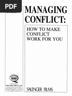 The Dana Mediation Institutes Organizational Cost of Conflict Measure provides an excellent tool for analyzing the out of pocket costs of conflict (www.mediationworks.com/ ). It categorizes a number of cost factors related to conflict and provides a means of estimating these costs for an organization. Some of the key costs include managerial time spent on conflict, employee retention, absenteeism, and legal costs. The Dana measure helps organizations quantify this cost by asking about the amount of time typically spent by managers on conflict, average manager salary and benefits, and the number of managers in an organization. Even using conservative figures, most organizations find that the costs are very substantial. A number of studies over the past thirty years have asked managers about the percentage of their time they spend dealing with conflict. The numbers consistently fall in the 20-40% range. Improved conflict management skills wont completely eliminate this number but it can certainly reduce it. One of the most significant reasons for employees leaving a job is ongoing conflict with a supervisor or with colleagues. When factoring in the costs of finding a replacement and bringing the new person up to speed, such turnover can be expensive. When employees experience distressing conflict at work, some will respond by staying away. This avoiding behavior can take the form of absenteeism which hurts overall productivity. Perhaps even more problematic is presenteeism, where the employee comes to work but isnt effectively because they are obsessing about the