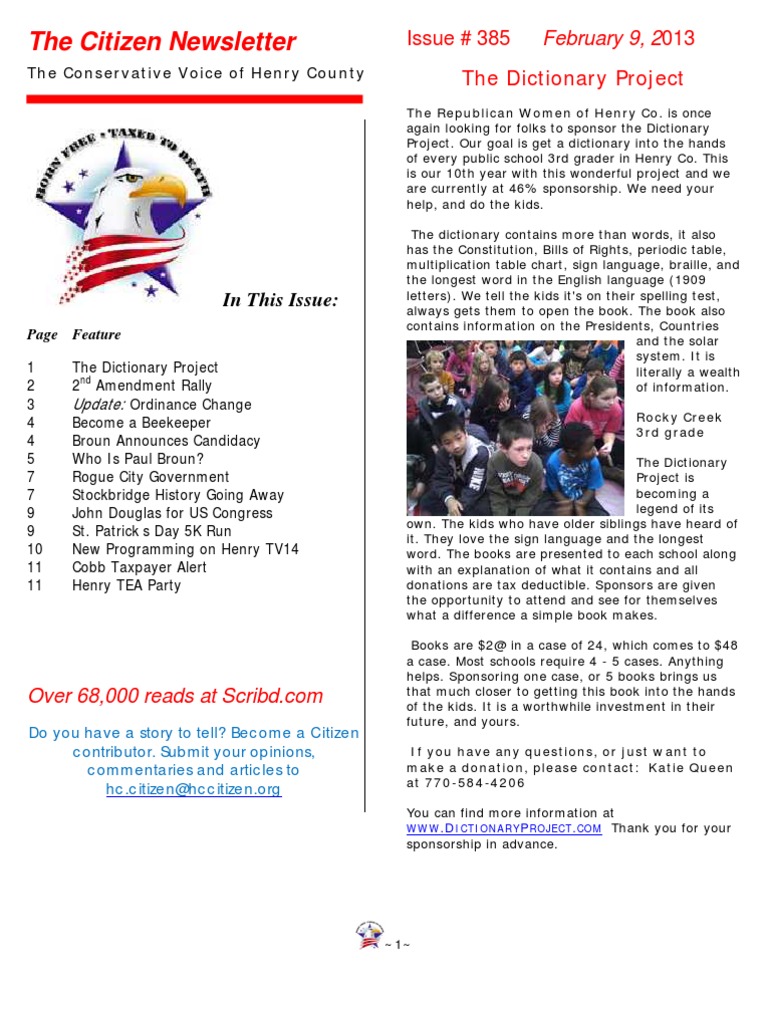 Page Feature 1 2 3 4 4 5 7 7 9 9 10 11 11 The Dictionary Project 2nd Amendment Rally Update: Ordinance Change Become a Beekeeper Broun Announces Candidacy Who Is Paul Broun? Rogue City Government Stockbridge History Going Away John Douglas for US Congress St. Patricks Day 5K Run New Programming on Henry TV14 Cobb Taxpayer Alert Henry TEA Party