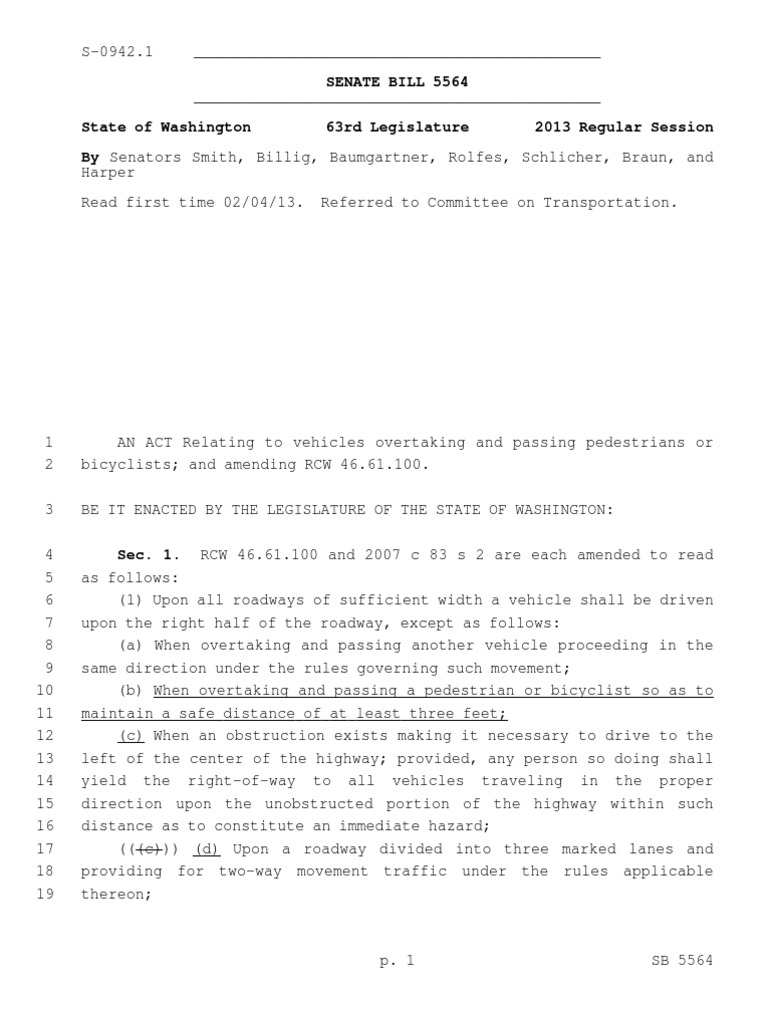 Senators Smith, Billig, Baumgartner, Rolfes, Schlicher, Braun, andHarperRead first time 02/04/13. Referred to Committee on Transportation. 1AN ACT Relating to vehicles overtaking and passing pedestrians or 2bicyclists; and amending RCW46.61.100. 3BE IT ENACTED BY THE LEGISLATURE OF THE STATE OF WASHINGTON: 4