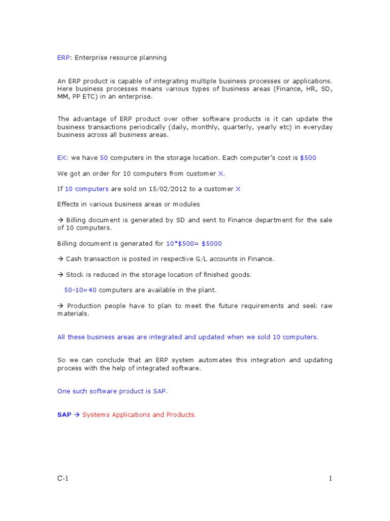 Here business processes means various types of business areas (Finance, HR, SD, MM, PP ETC) in an enterprise. The advantage of ERP product over other software products is it can update the business transactions periodically (daily, monthly, quarterly, yearly etc) in everyday business across all business areas. EX: we have 50 computers in the storage location. Each computers cost is $500 We got an order for 10 computers from customer X. If 10 computers are sold on 15/02/2012 to a customer X Effects in various business areas or modules Billing document is generated by SD and sent to Finance department for the sale of 10 computers. Billing document is generated for 10*$500= $5000 Cash transaction is posted in respective G/L accounts in Finance. Stock is reduced in the storage location of finished goods. 50-10=40 computers are available in the plant. Production people have to plan to meet the future requirements and seek raw materials. All these business areas are integrated and updated when we sold 10 computers. So we can conclude that an ERP system automates this integration and updating process with the help of integrated software. One such software product is SAP. SAP Systems Applications and Products.