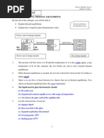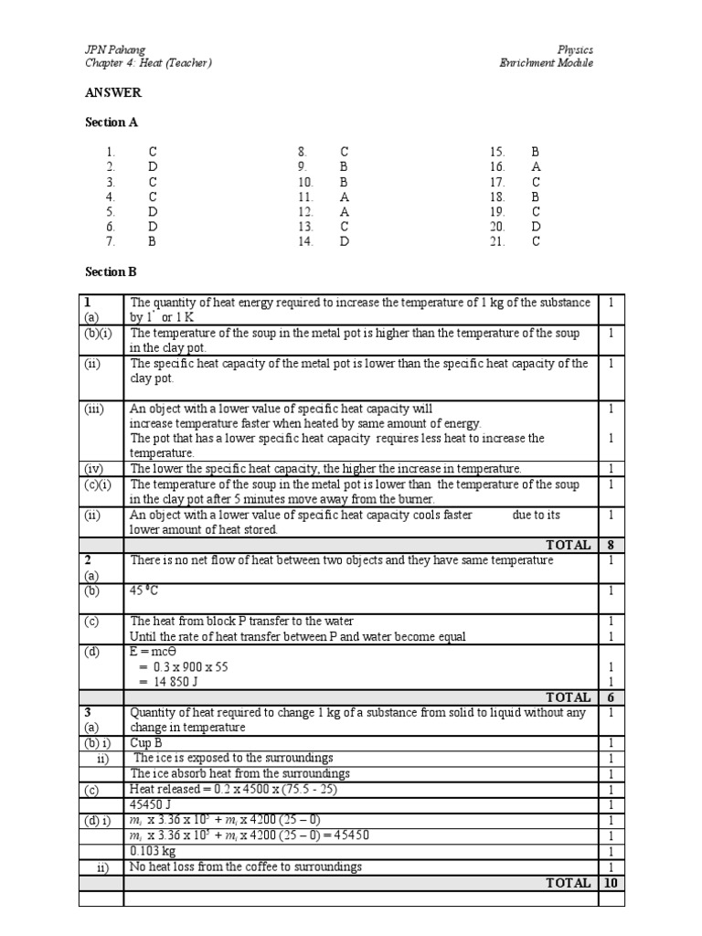 ANSWER Section A 1. 2. 3. 4. 5. 6. 7. Section B 1 (a) (b)(i) (ii) (iii) The quantity of heat energy required to increase the temperature of 1 kg of the substance by 1 or 1 K The temperature of the soup in the metal pot is higher than the temperature of the soup in the clay pot. The specific heat capacity of the metal pot is lower than the specific heat capacity of the clay pot. An object with a lower value of specific heat capacity will increase temperature faster when heated by same amount of energy. The pot that has a lower specific heat capacity requires less heat to increase the temperature. The lower the specific heat capacity, the higher the increase in temperature. The temperature of the soup in the metal pot is lower than the temperature of the soup in the clay pot after 5 minutes move away from the burner. An object with a lower value of specific heat capacity cools faster due to its lower amount of heat stored. TOTAL There is no net flow of heat between two objects and they have same temperature 45 0C The heat from block P transfer to the water Until the rate of heat transfer between P and water become equal E = mc = 0.3 x 900 x 55 = 14 850 J TOTAL Quantity of heat required to change 1 kg of a substance from solid to liquid without any change in temperature Cup B The ice is exposed to the surroundings The ice absorb heat from the surroundings Heat released = 0.2 x 4500 x (75.5 - 25) 45450 J mi x 3.36 x 105 + mi x 4200 (25 0) mi x 3.36 x 105 + mi x 4200 (25 0) = 45450 0.103 kg No heat loss from the coffee to surroundings TOTAL 1 1 1 1 1 1 1 1 8 1 1 1 1 1 1 6 1 1 1 1 1 1 1 1 1 1 10 C D C C D D B 8. 9. 10. 11. 12. 13. 14. C B B A A C D 15. 16. 17. 18. 19. 20. 21. B A C B C D C